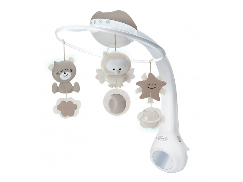 Hudební kolotoč se světelným projektorem pro snadné usínání i zabavení dítěte. Světelný projektor promítá na stěnu či strop hvězdičky a jemně tak osvítí dětský pokoj. Spolu s uklidňující melodií pomůže vašemu dítěti v klidu usínat. Nabízí na výběr z 10 uklidňujících melodií a zvuků přírody. Melodie a přírodní zvuky kolotoč po zapnutí přehrává 20 minut. Kolotoč s projektorem nabízí 3 možnosti použití: